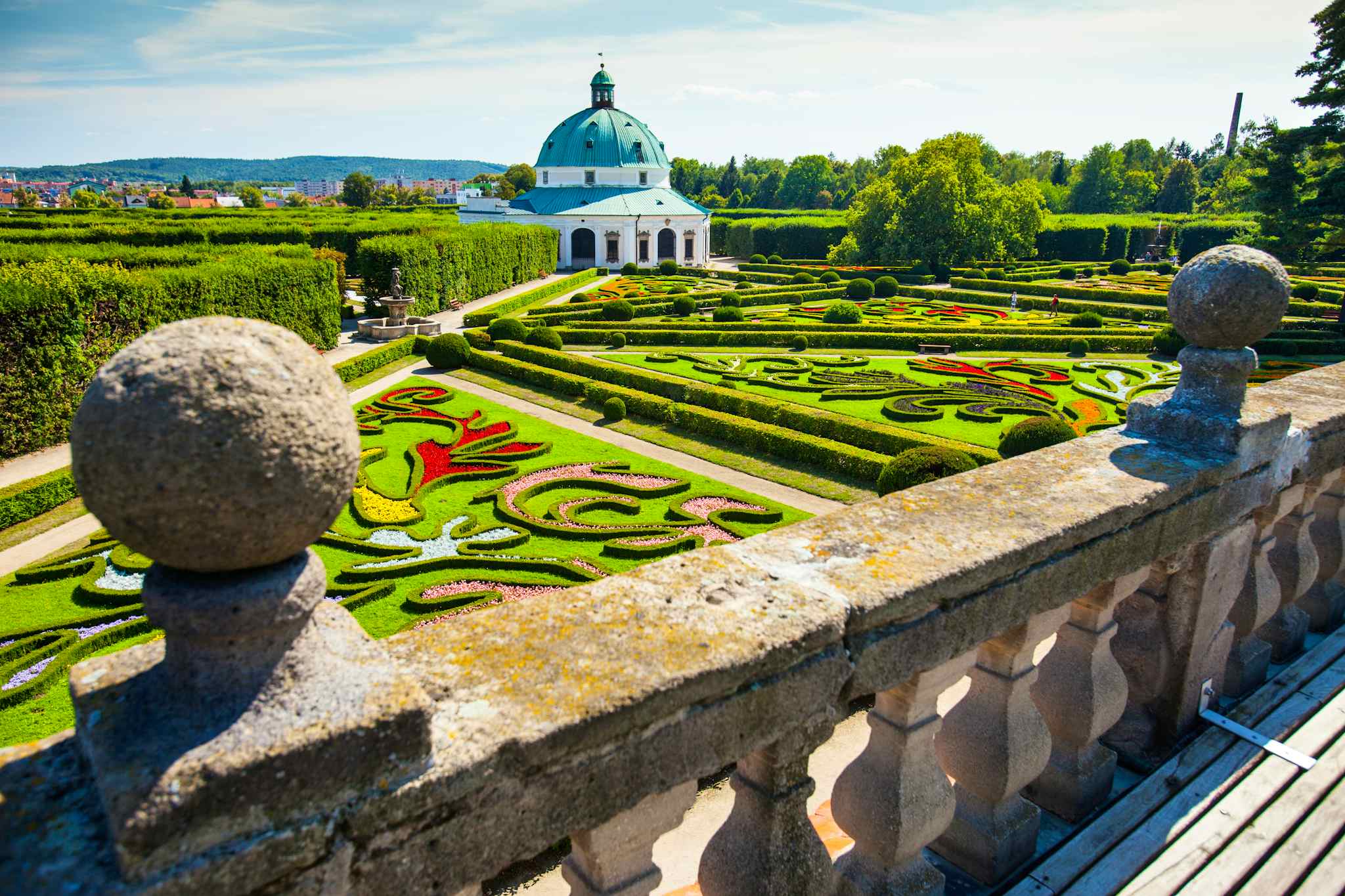 A prize that would no doubt bring a rosy bloom to the cheeks of the successive Olomouc Archbishops who lavished such care upon their summer residence. Money was no obstacle for the enthusiastically green-fingered Archbishops when it came to employing the finest artists, architects and engineers. More delightful places to wander and marvel at the art of landscape gardening than the Chateau and Floral Gardens is hard to imagine. Each has its particular charm and elegance. The hedge labyrinths in the Flower Garden, or Libosad, designed by imperial architect Giovanni Tencalla, are ideal for intimate strolling, while historic greenhouses and original floral decorations stimulate the senses. Originally a humble vegetable garden The Chateau Garden had a Seventeeth Century Baroque makeover that extended it from the Chateau to the Morava river. Water elements predominate today in the form of ponds, springs and sheets, providing a sparkling background to the rich variety of colourful plants and flowers arranged around the gardens romantic collonades, courtyards and pavilions.